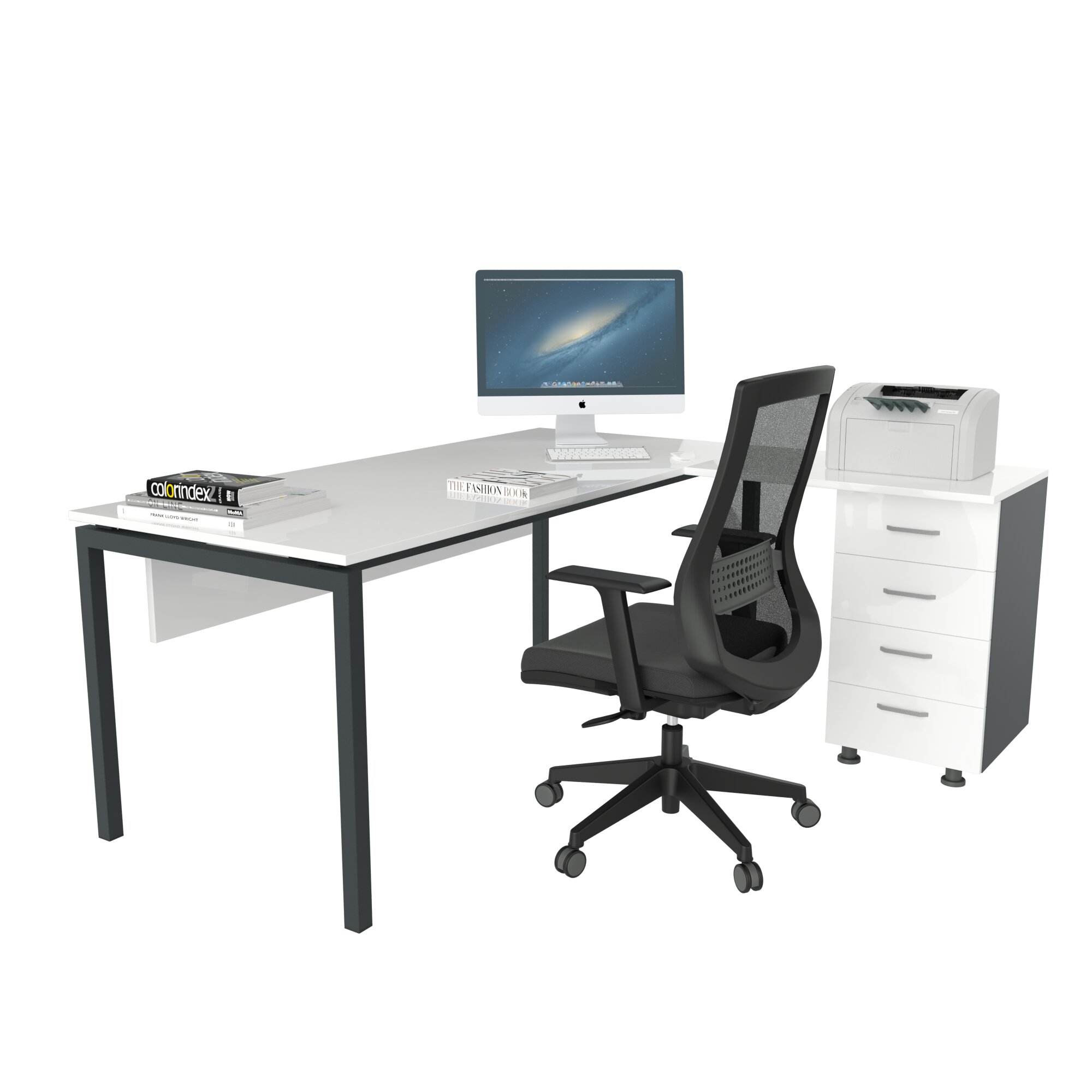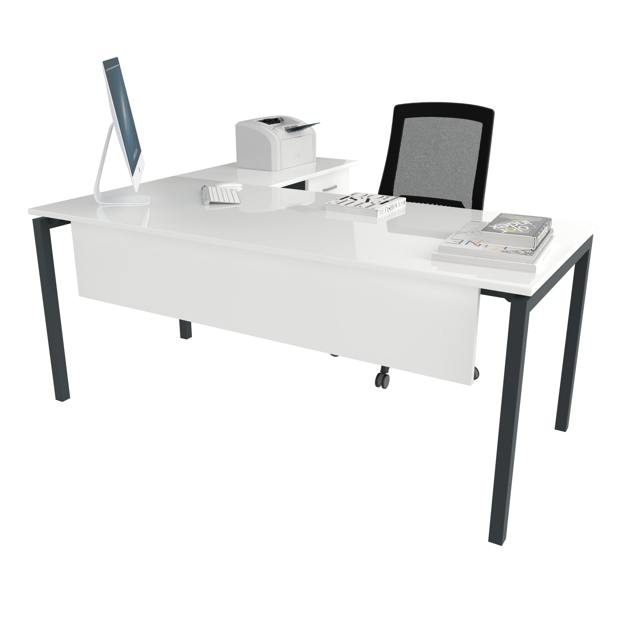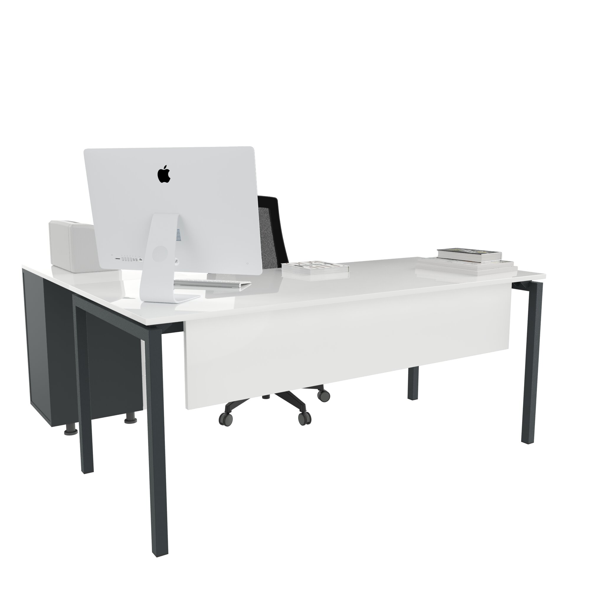 Ear L Etajerli Masa, modern ve fonksiyonel tasarımıyla hem kurumsal ofislerde hem ev ofislerde düzenli, verimli ve konforlu bir çalışma alanı oluşturmak için tasarlanmış bir ofis mobilyasıdır