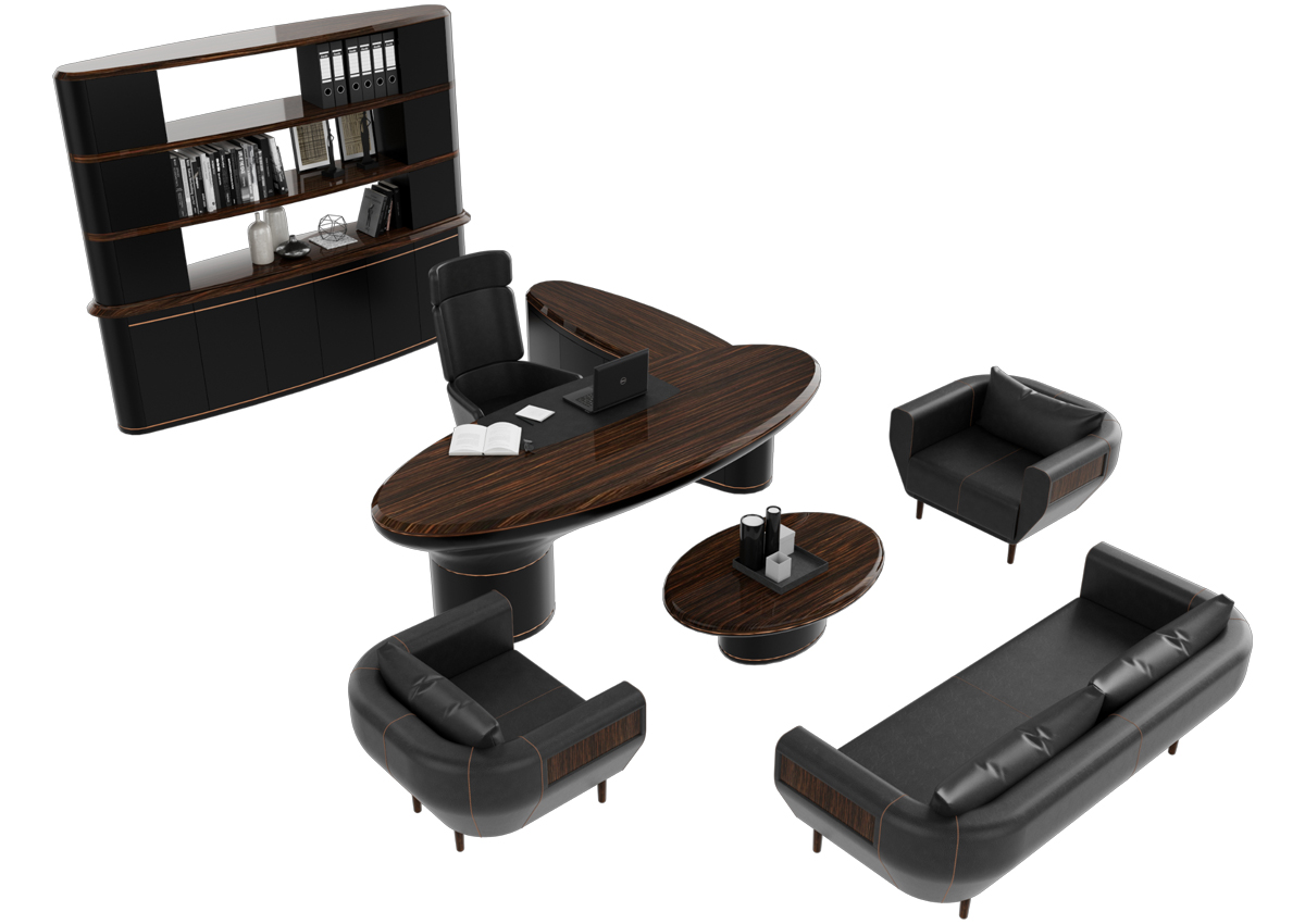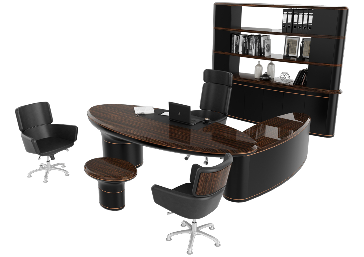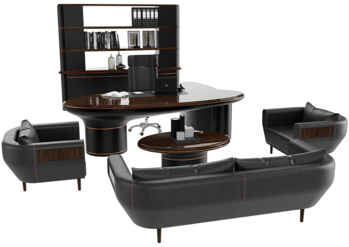 Güçlü tasarım dili, modern çizgileri ve iddialı duruşuyla Fungos Makam Takımı; prestiji ve konforu bir arada sunan özel bir VIP yönetici koleksiyonudur. Oval hatlara sahip etajerli masa formu, mekâna dinamizm katarken; parlak ahşap dokular ve mat lake yüzeyler lüks bir bütünlük oluşturur.