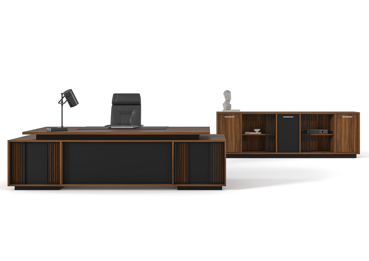 Origami Makam Takımı; keskin geometrik çizgileri, modern siyah tasarımı ve fonksiyonel modülleriyle yönetici ofislerine güçlü bir prestij kazandırır.