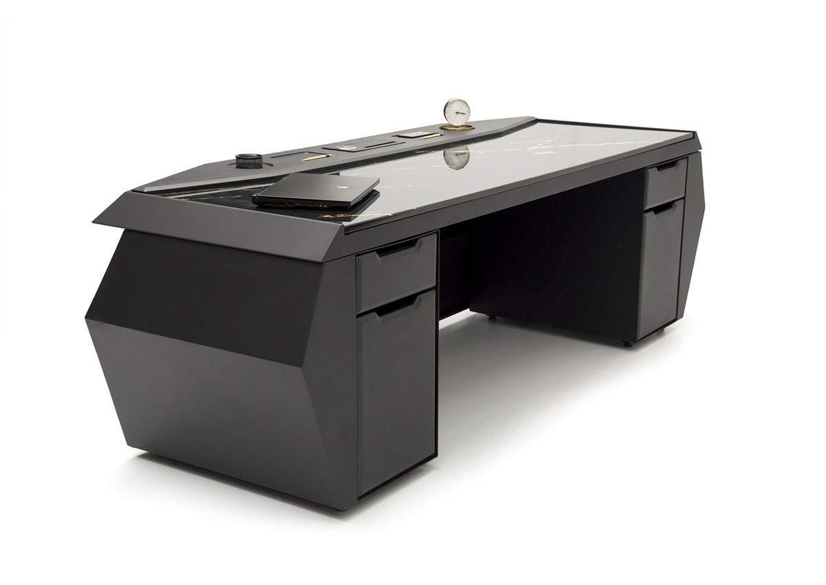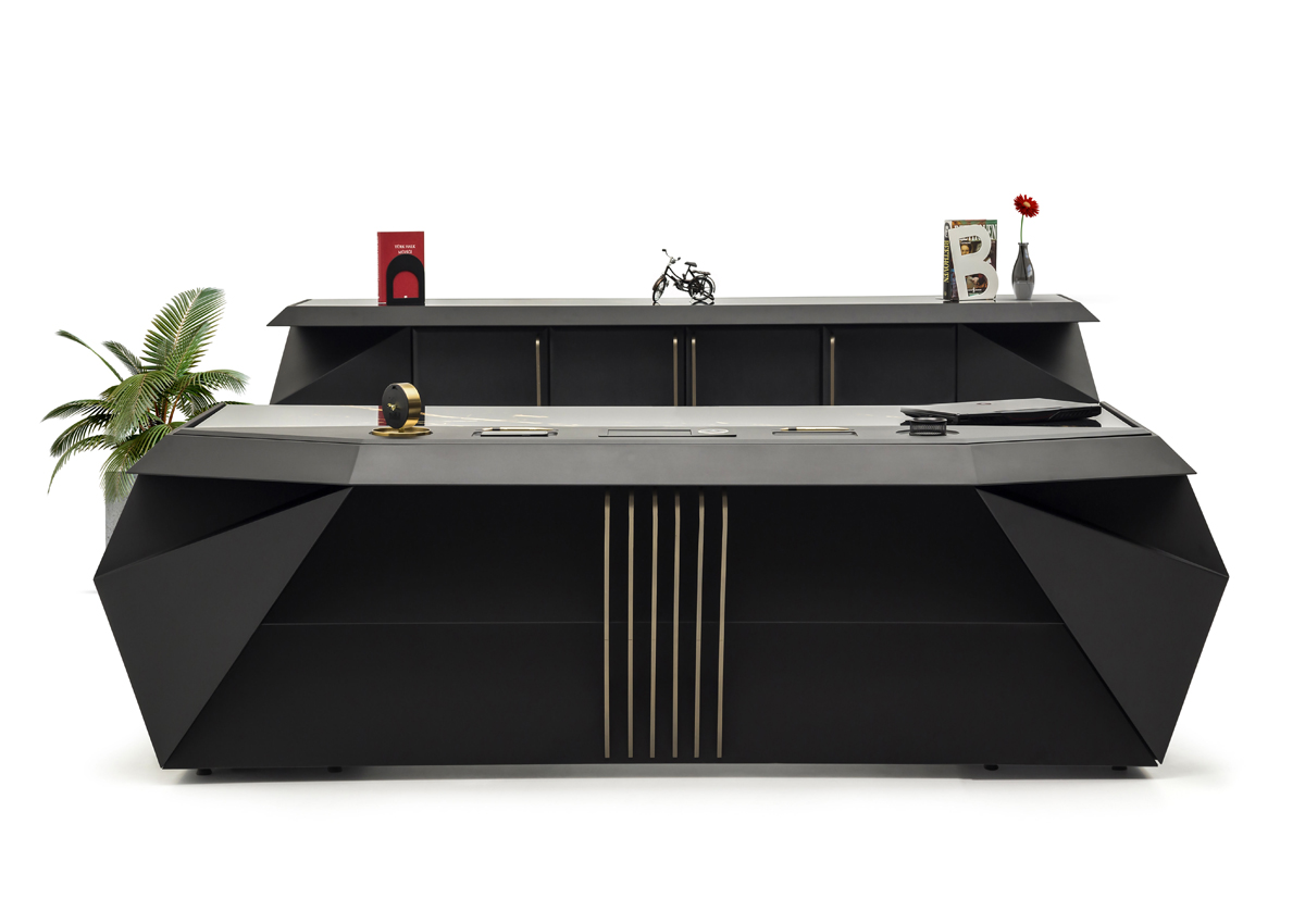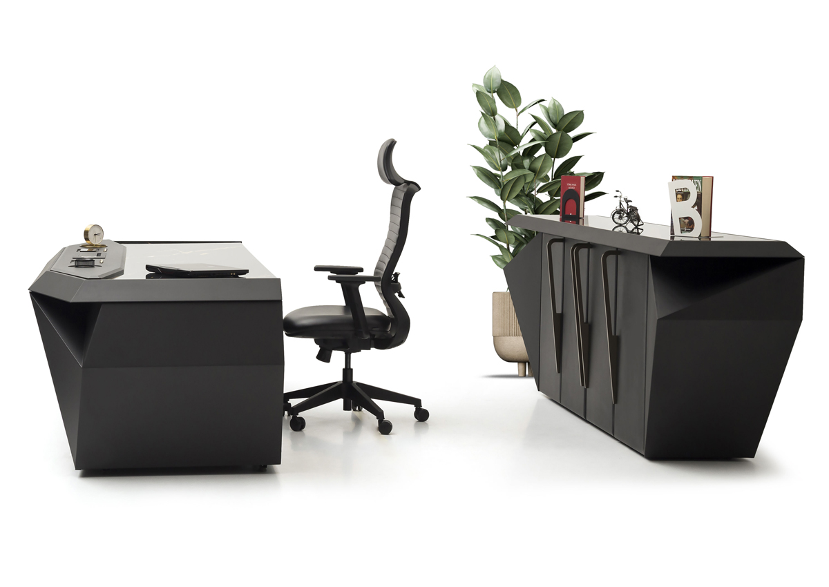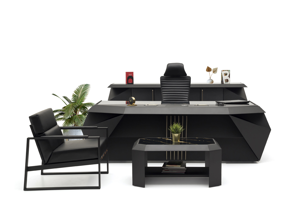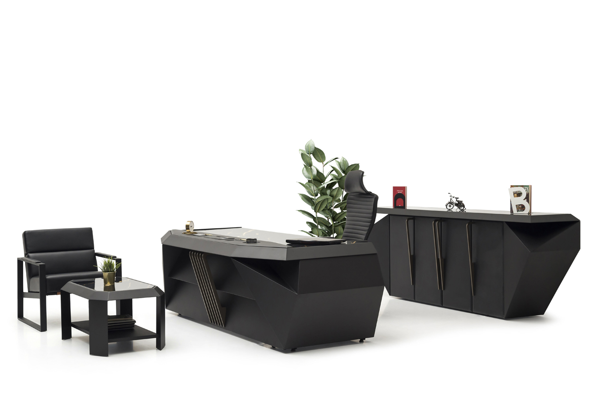 Kraft Makam Takımı, keskin hatları ve modern geometrik formuyla yönetici ofislerinde güçlü bir izlenim bırakmak üzere tasarlanmıştır. Siyah rengin karizmatik duruşu, metal detaylarla birleşerek çağdaş ve prestijli bir makam atmosferi oluşturur.