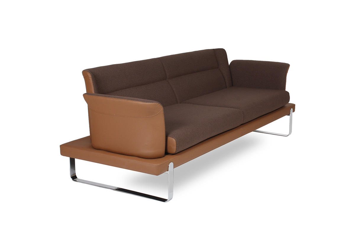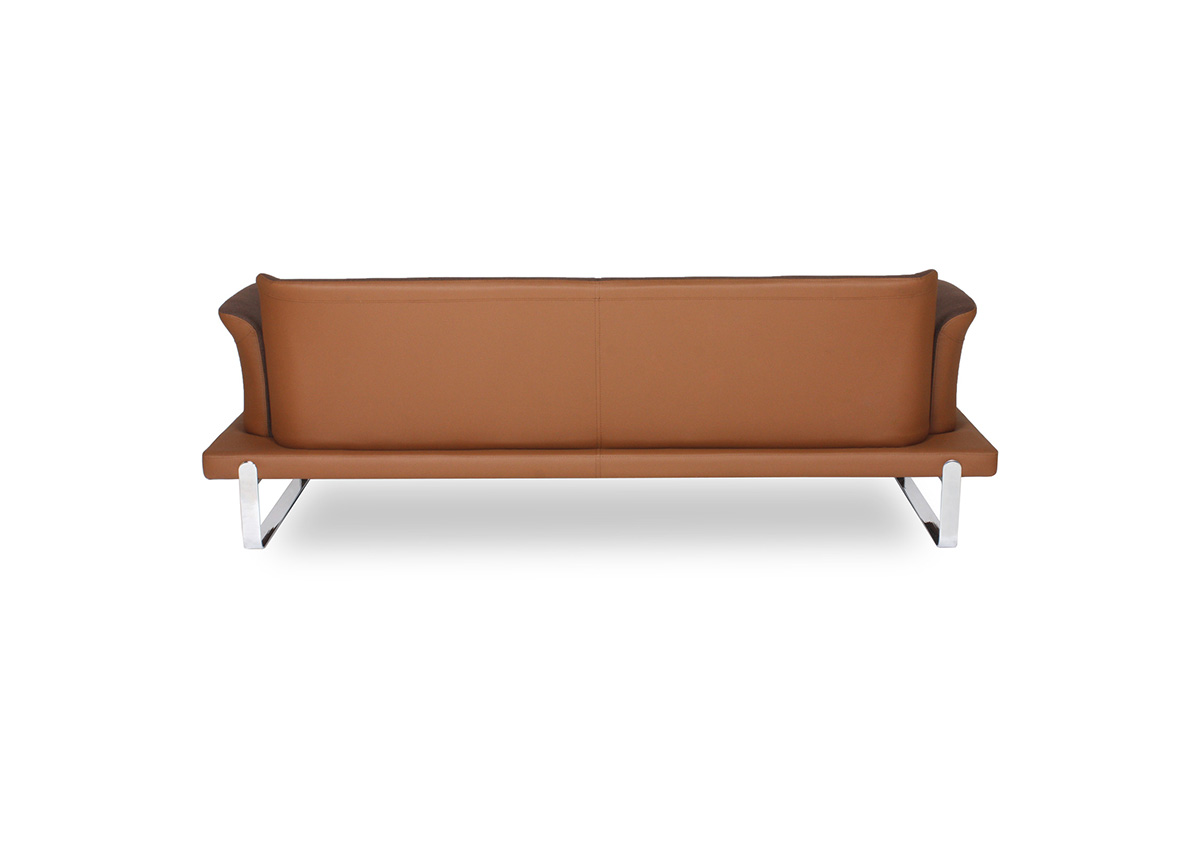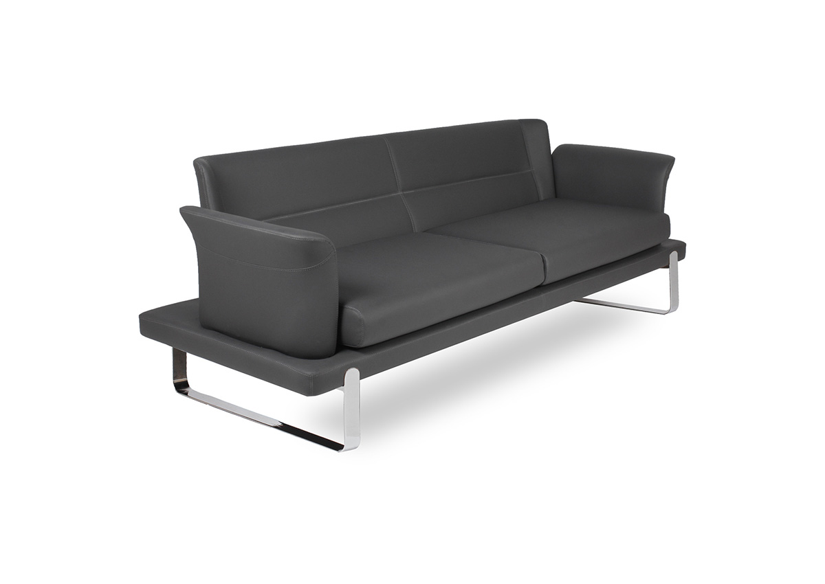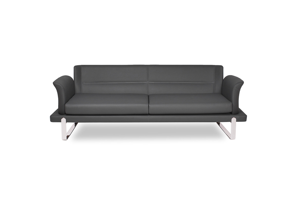Üç bağımsız oturum bölümüne sahip geniş ve kesintisiz oturum yüzeyi, yüksek yoğunluklu sünger dolguyla birlikte üç kullanıcıya bireysel ve konforlu bir bekleme deneyimi sunar. Zarif kanat formlu kol yapıları, geniş kanepe gövdesine karşın ürüne asil ve rafine bir görünüm katar; içe doğru kıvrılan kol uçları ise hem oturana yan destek hem de tasarıma dinamik bir bitişe sağlar. Parlak krom kızak metal taban, kanepenin geniş ve masif gövdesini zemine neredeyse temas etmeden taşıyarak mekânda görsel hafiflik ve premium bir duruş yaratır.