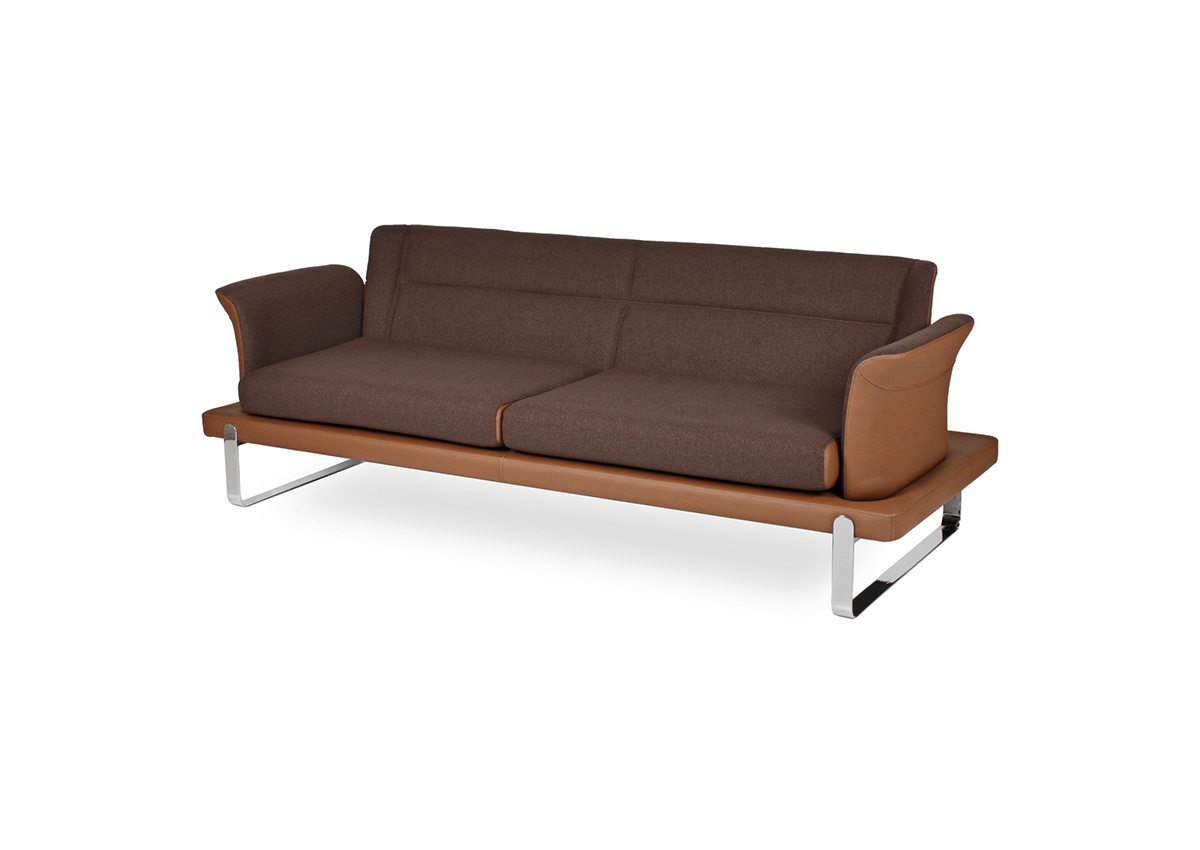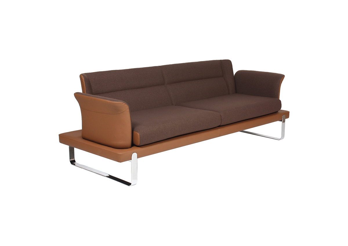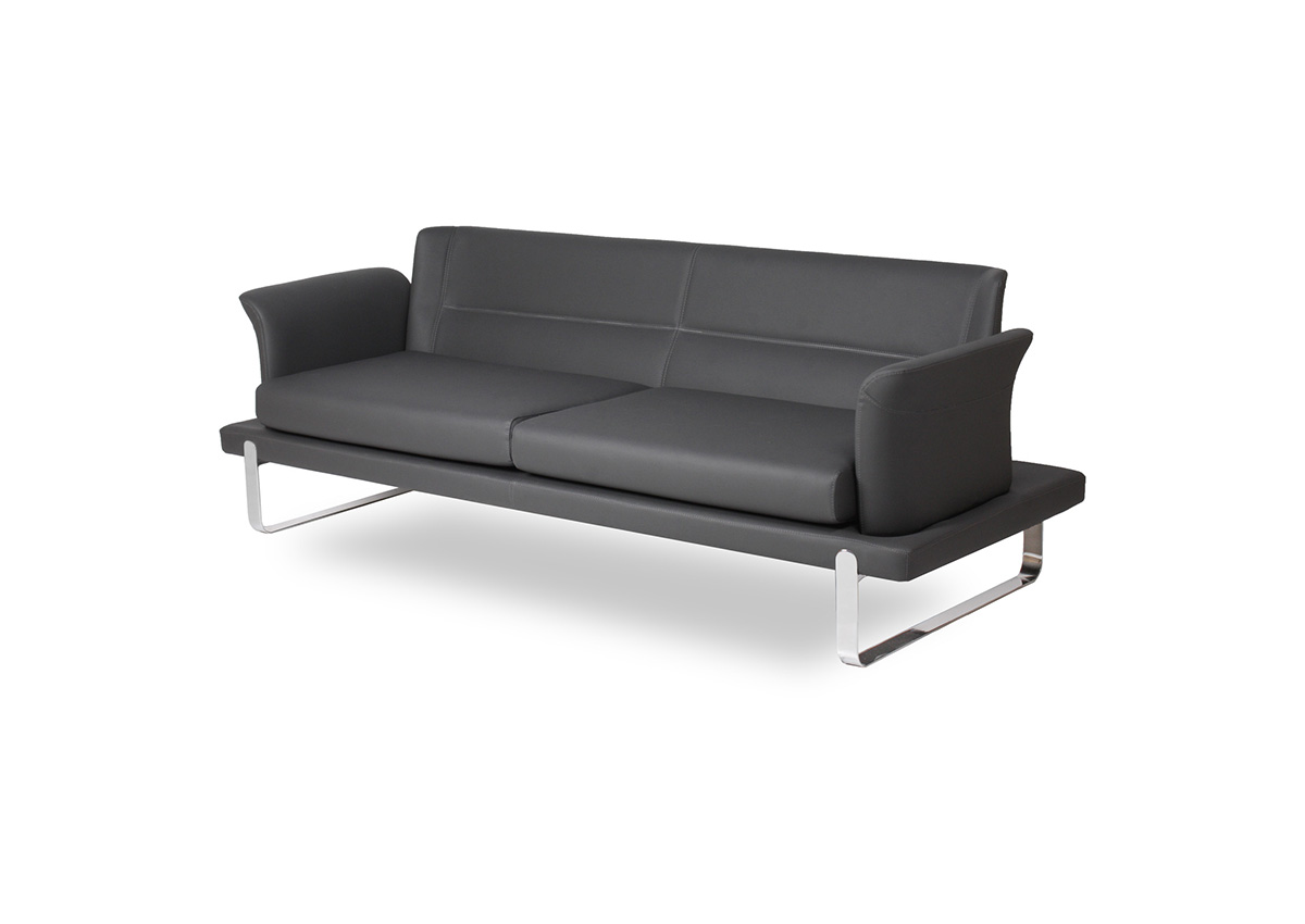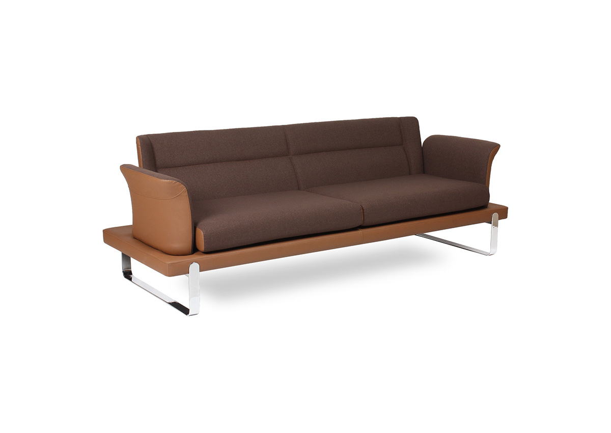 Üç bağımsız oturum bölümüne sahip geniş ve kesintisiz oturum yüzeyi, yüksek yoğunluklu sünger dolguyla birlikte üç kullanıcıya bireysel ve konforlu bir bekleme deneyimi sunar. Zarif kanat formlu kol yapıları, geniş kanepe gövdesine karşın ürüne asil ve rafine bir görünüm katar; içe doğru kıvrılan kol uçları ise hem oturana yan destek hem de tasarıma dinamik bir bitişe sağlar. Parlak krom kızak metal taban, kanepenin geniş ve masif gövdesini zemine neredeyse temas etmeden taşıyarak mekânda görsel hafiflik ve premium bir duruş yaratır.