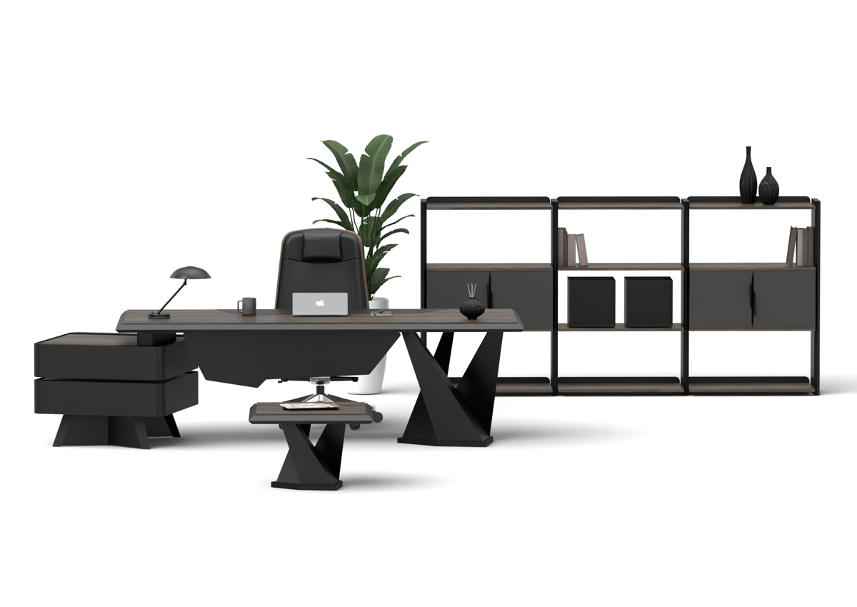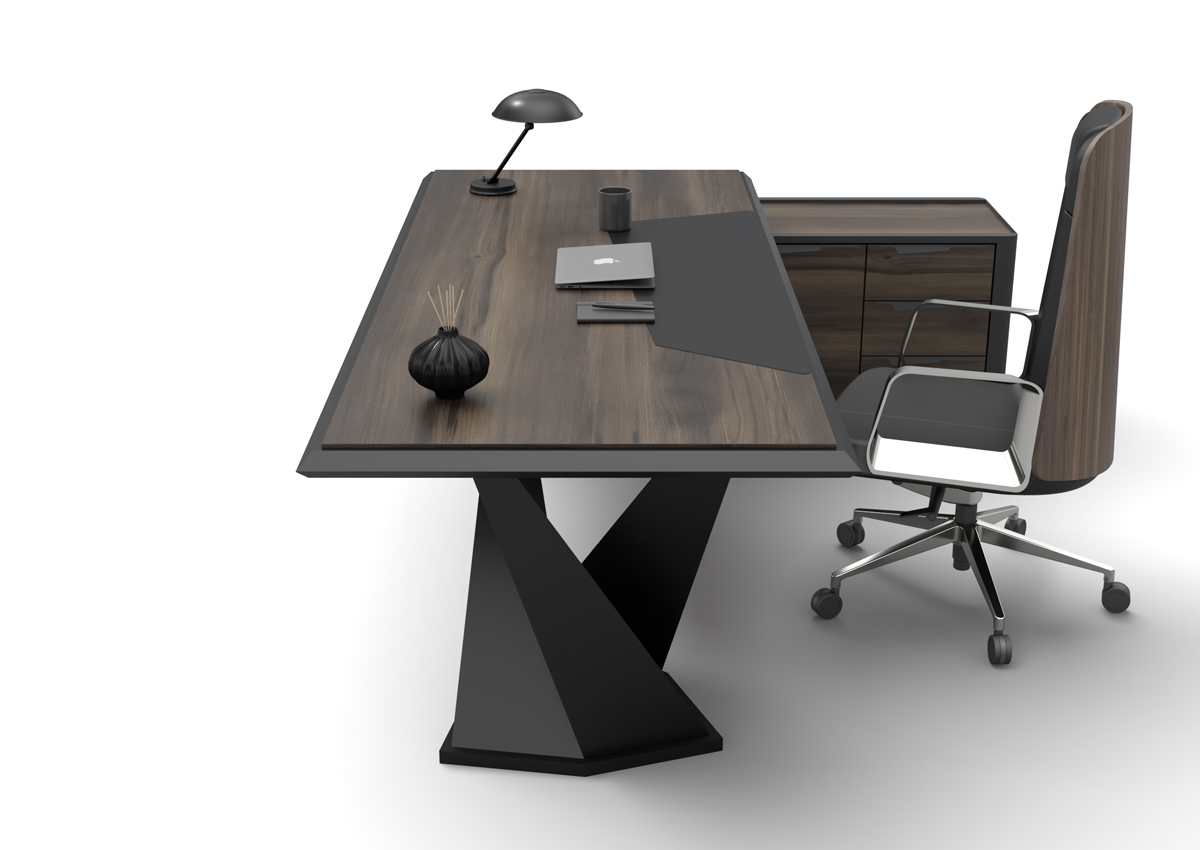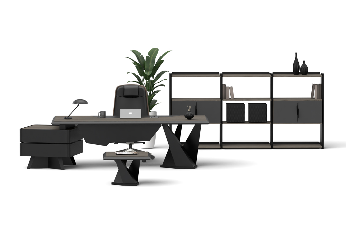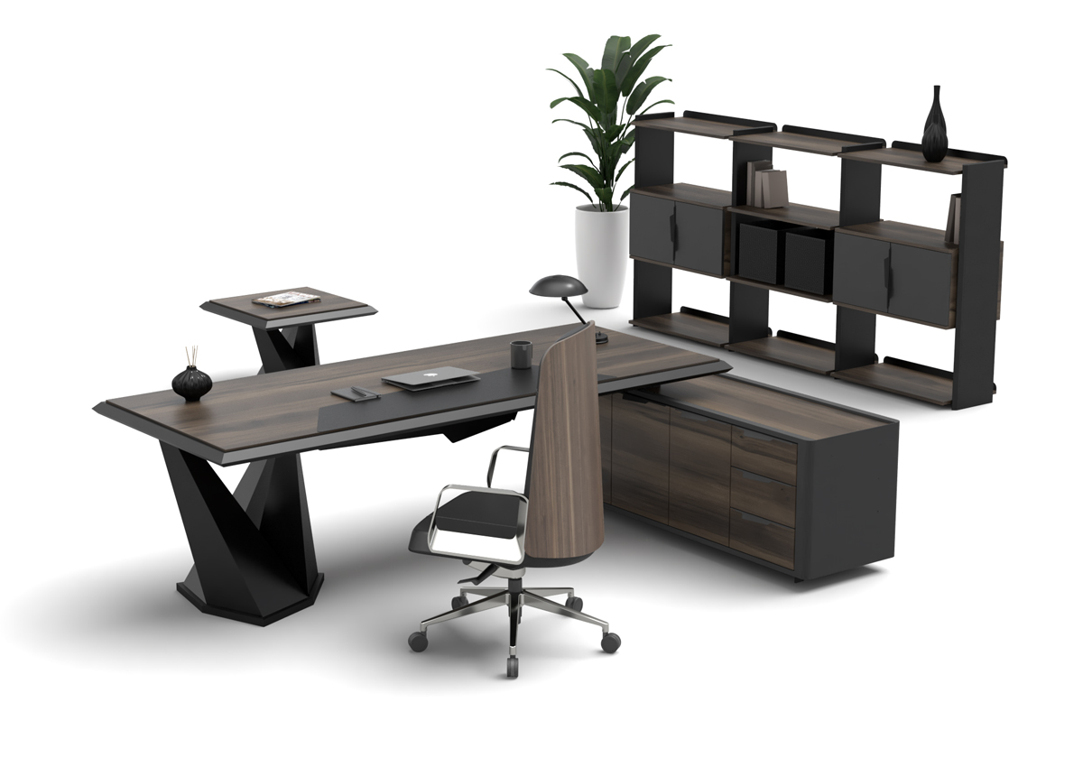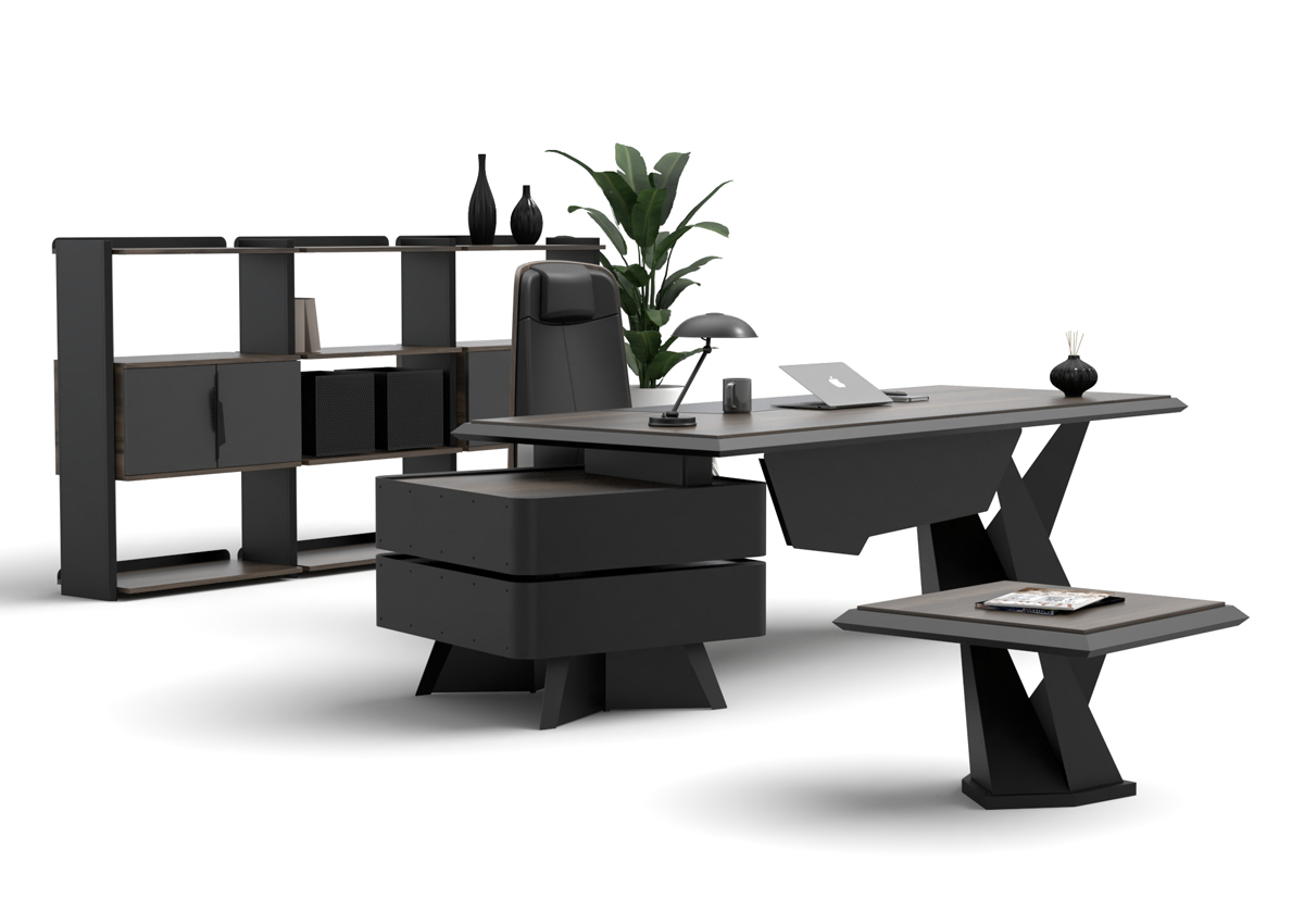 Origami Makam Takımı; keskin geometrik çizgileri, modern siyah tasarımı ve fonksiyonel modülleriyle yönetici ofislerine güçlü bir prestij kazandırır.