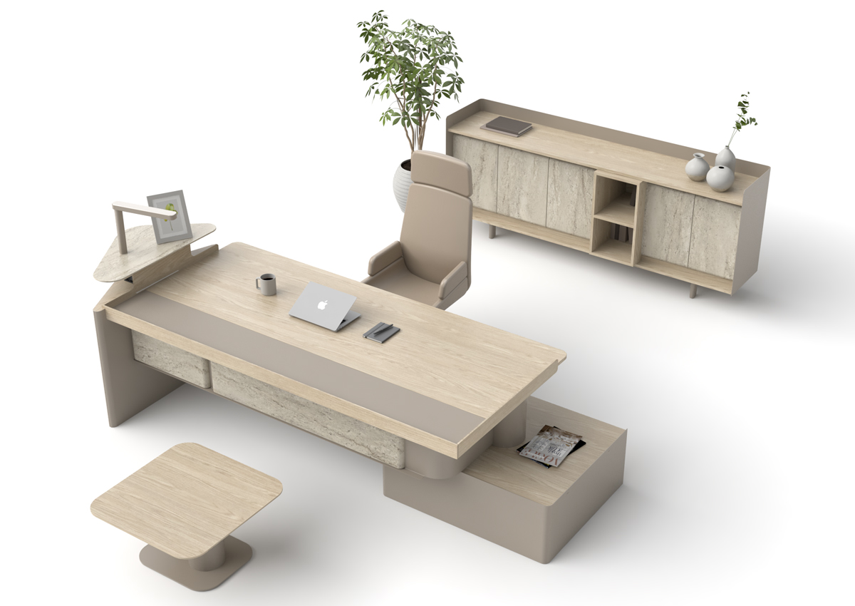 Polygon Makam Takımı, yalın tasarım anlayışı ve modern mimari çizgileriyle yönetici ofislerinde ferah ve prestijli bir çalışma ortamı oluşturmak için tasarlanmıştır. Açık renk tonlarının doğal dokularla birleştiği bu özel takım, ofis dekorasyonuna zarif bir bütünlük kazandırır.