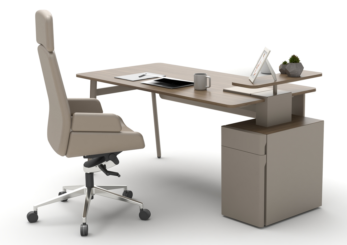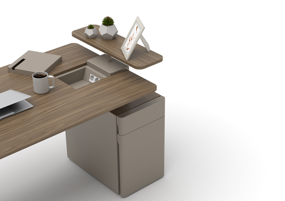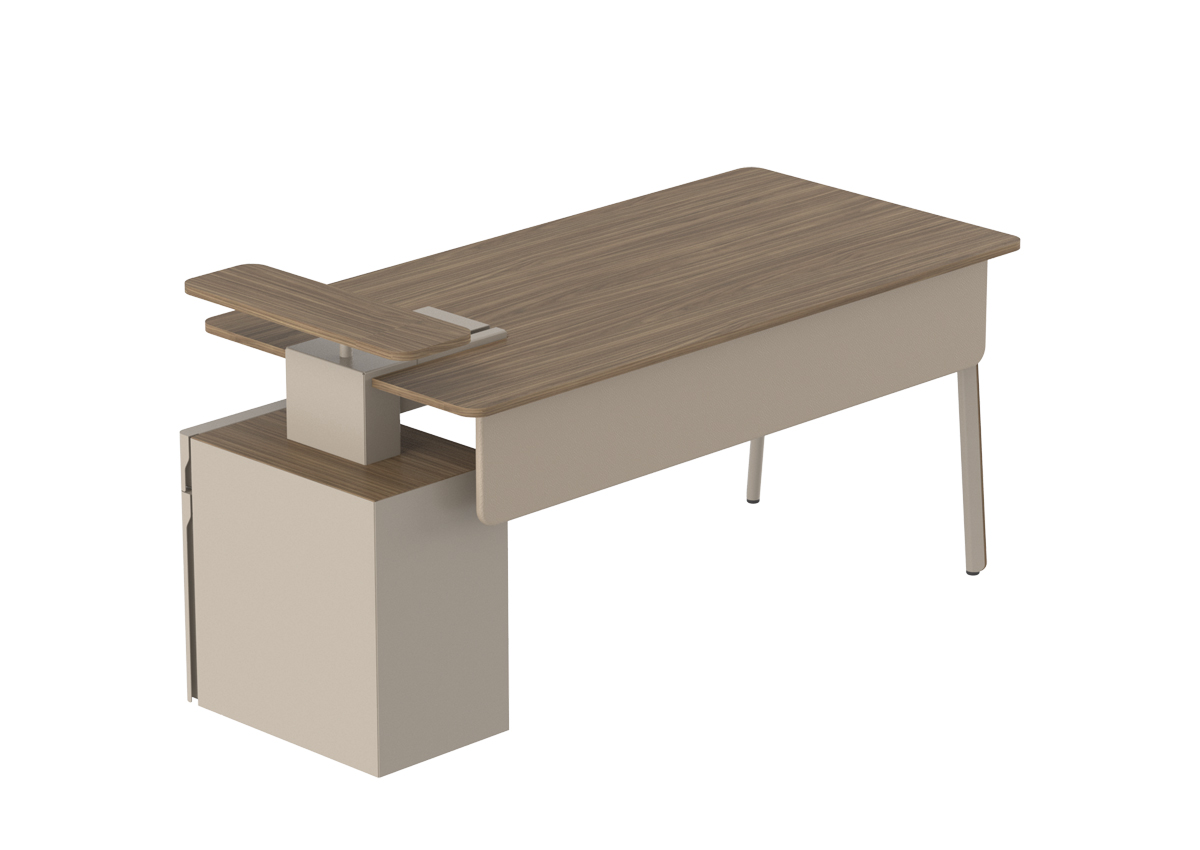 Ear L Etajerli Masa, modern ve fonksiyonel tasarımıyla hem kurumsal ofislerde hem ev ofislerde düzenli, verimli ve konforlu bir çalışma alanı oluşturmak için tasarlanmış bir ofis mobilyasıdır