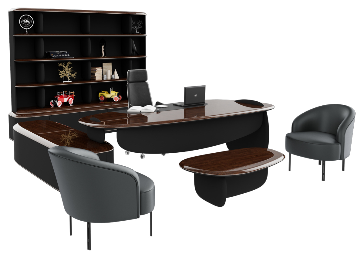 Kraft Makam Takımı; modern geometrik tasarımı, güçlü siyah duruşu ve fonksiyonel modülleriyle yönetici ofislerine prestij kazandırır.