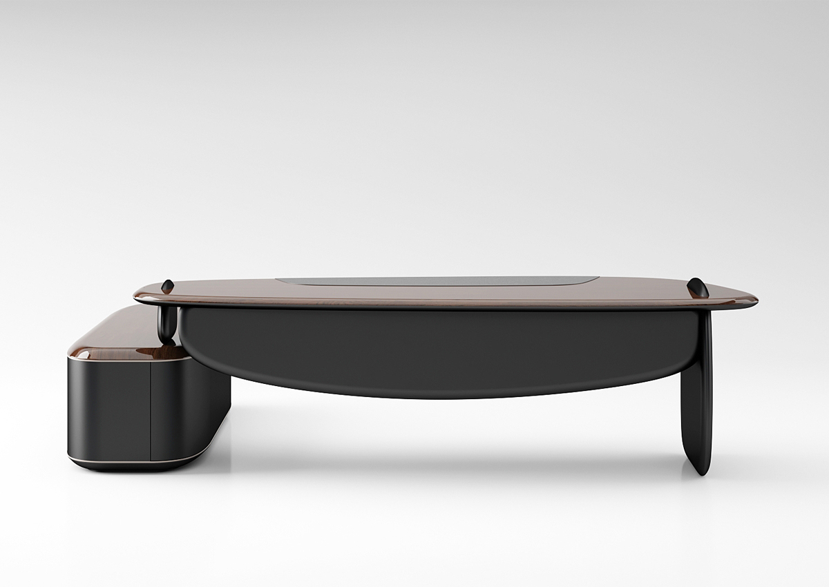 Flow Makam Odası; organik formdaki geniş masası, doğal taş dokulu detayları ve modern çizgileriyle yönetici ofislerine prestijli ve güçlü bir atmosfer kazandırır.