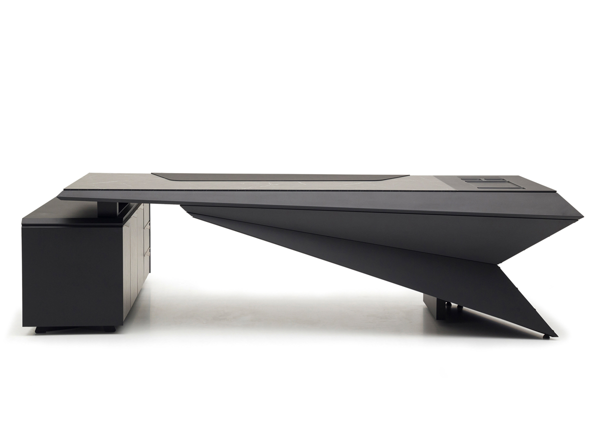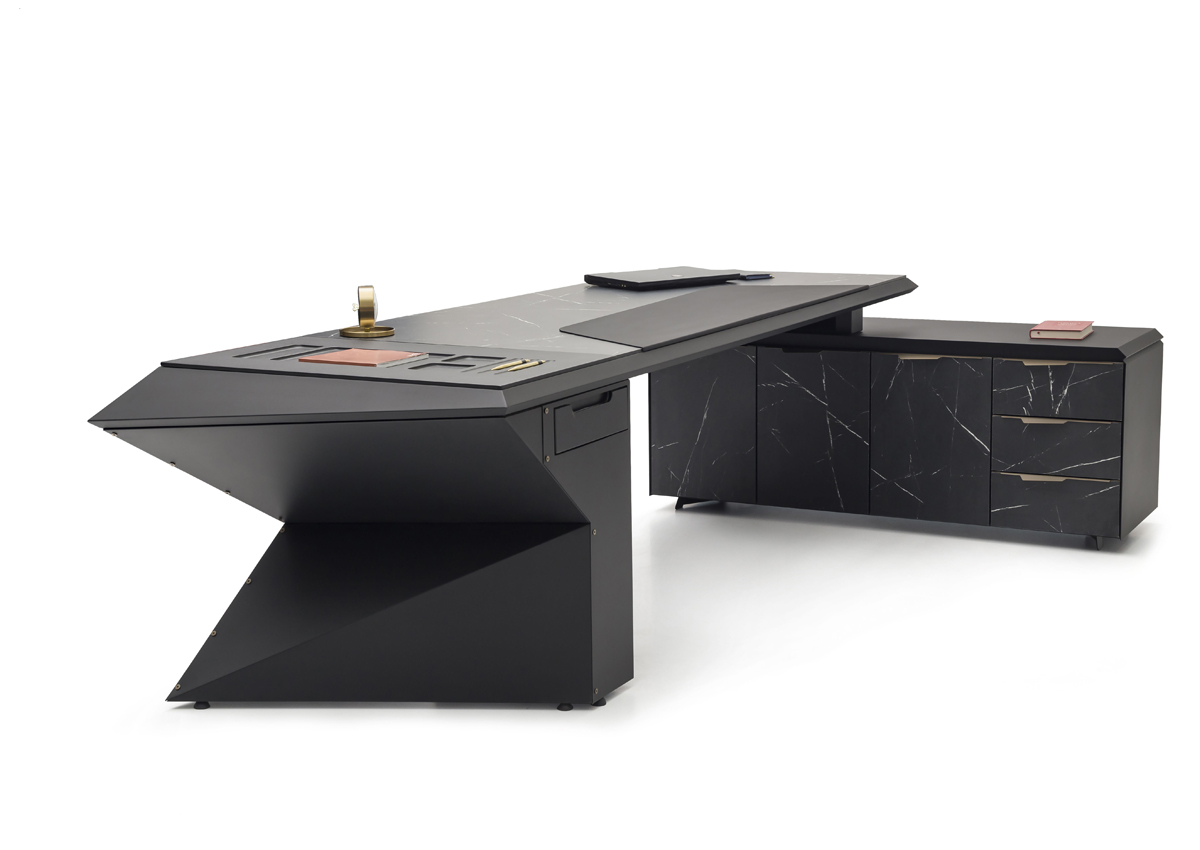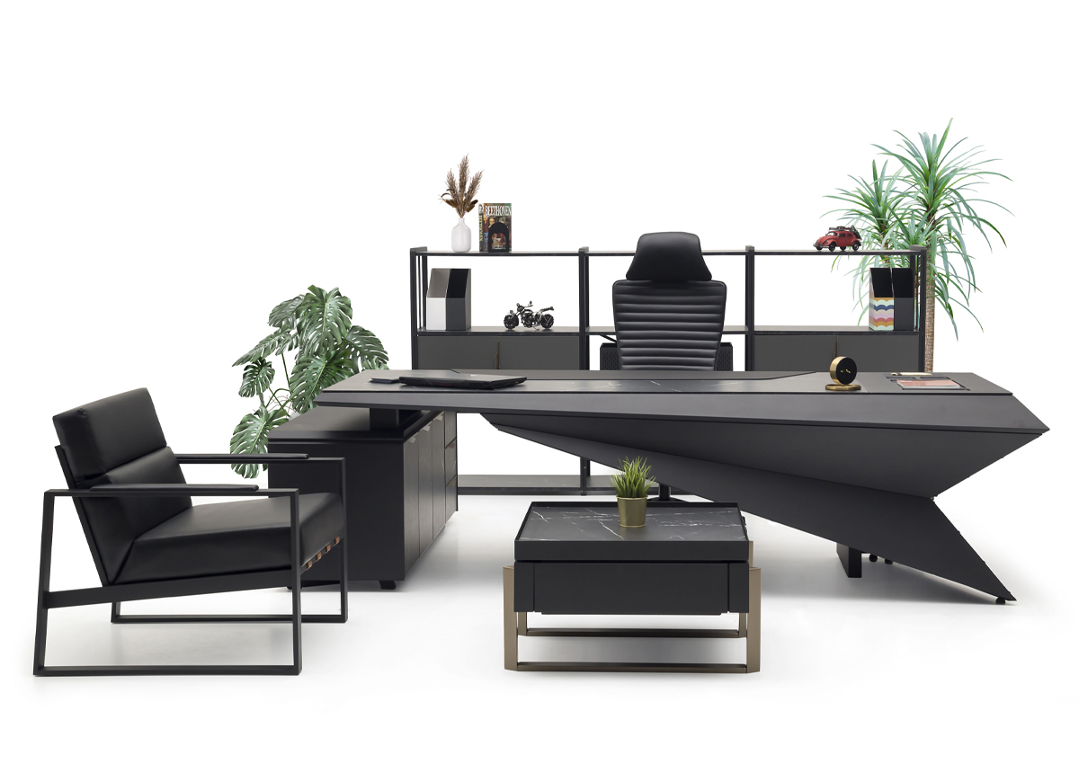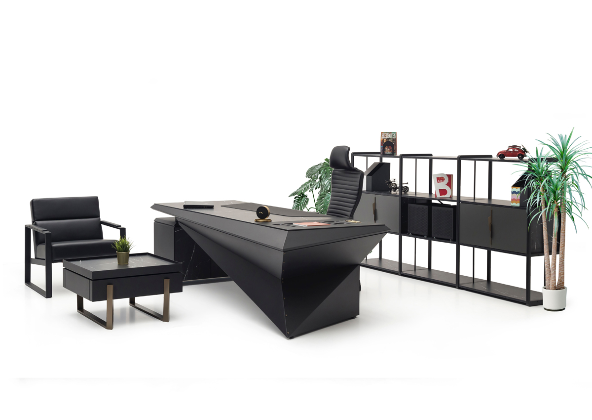 Origami Makam Takımı; keskin geometrik çizgileri, modern siyah tasarımı ve fonksiyonel modülleriyle yönetici ofislerine güçlü bir prestij kazandırır.