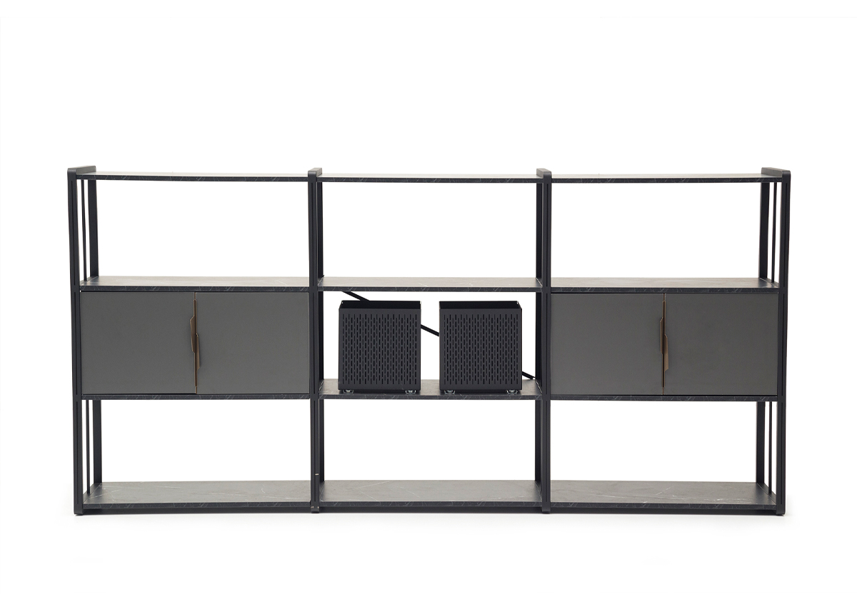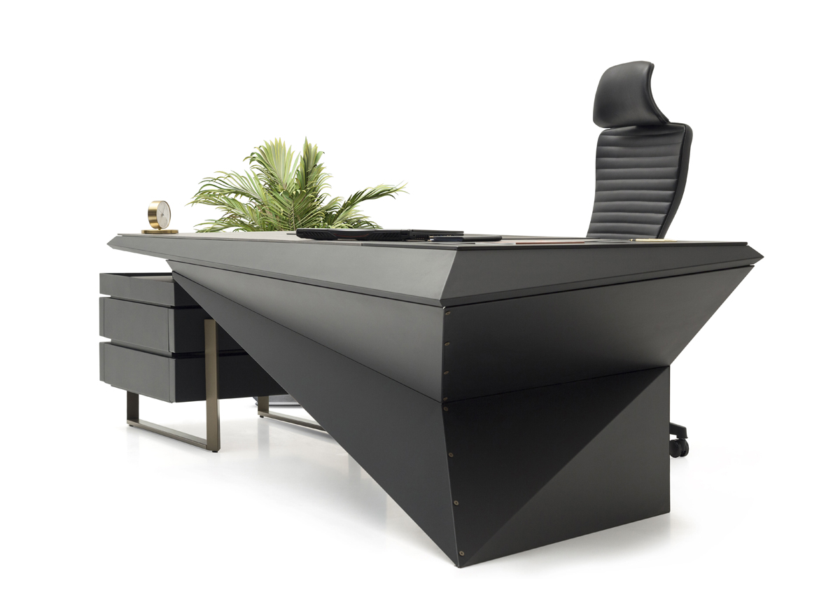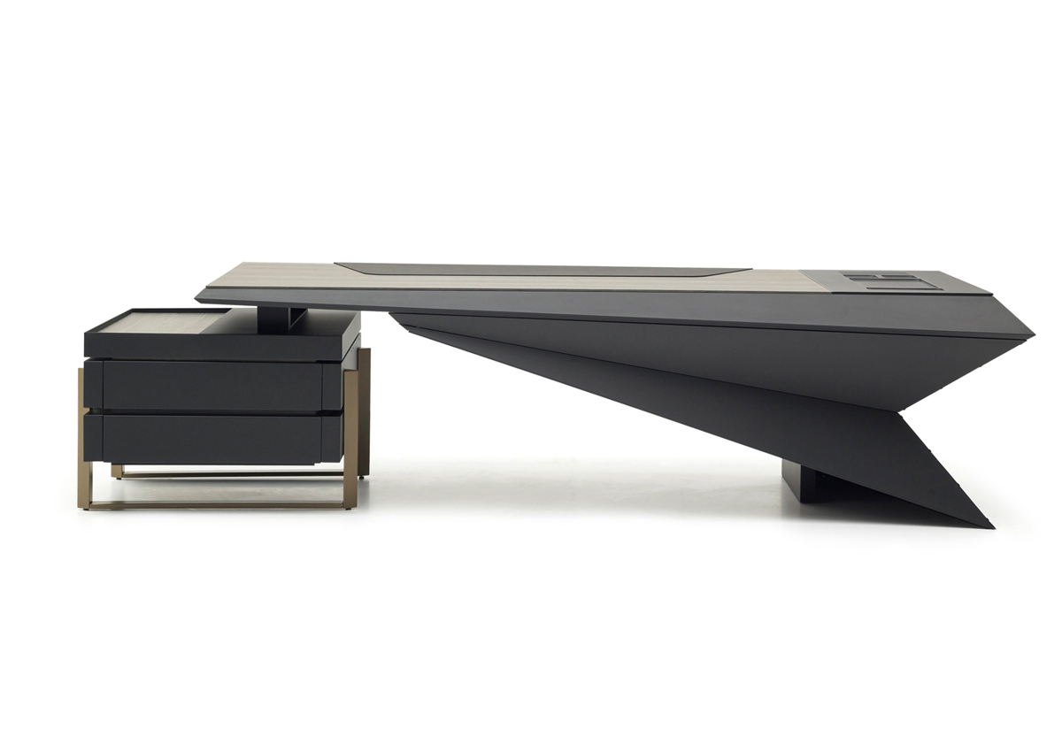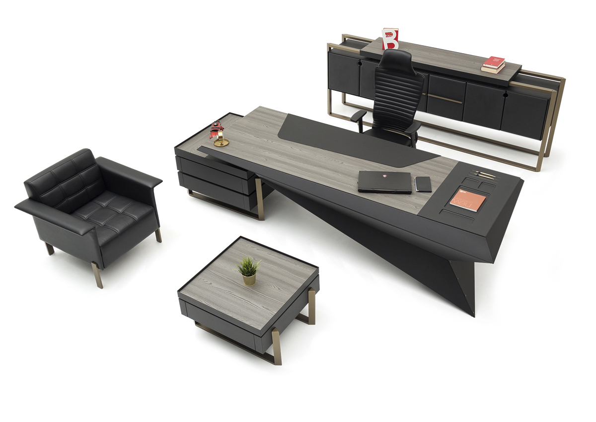 Origami Makam Takımı; keskin geometrik çizgileri, modern siyah tasarımı ve fonksiyonel modülleriyle yönetici ofislerine güçlü bir prestij kazandırır.